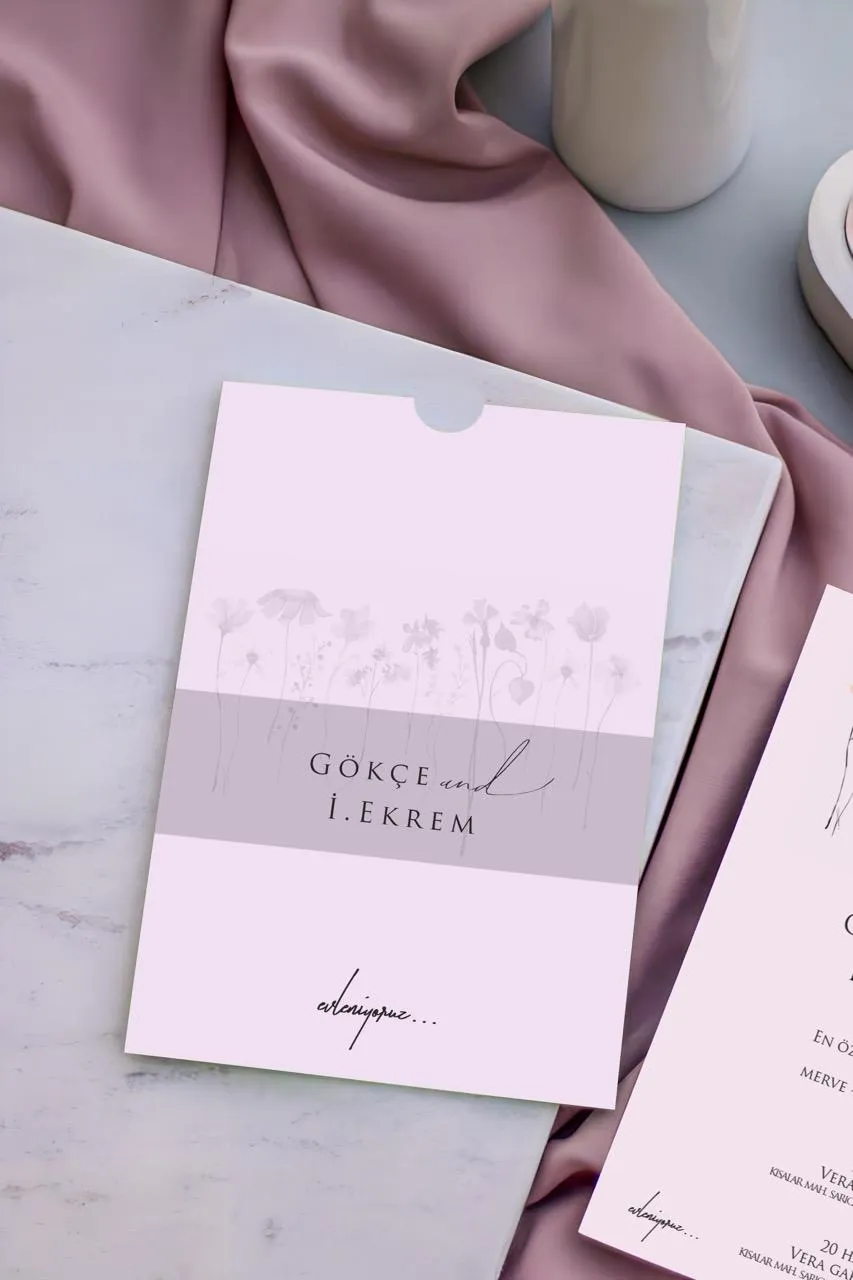 Baharı andıran romantik bir atmosferi modern tasarım çizgileriyle buluşturan BST-2353 modelimiz, canlı çiçek illüstrasyonlarıyla öne çıkıyor. “Gökçe & Ekrem” örneğinde görüldüğü gibi, kartın üst kısmına boydan boya yerleştirilen suluboya çiçek demeti, davetiyenize ilk bakışta taze, neşeli ve oldukça zarif bir hava katmaktadır. Bu model, aşk yolculuğunu renkli ve masalsı bir dokunuşla duyurmak isteyen çiftler için özel olarak tasarlandı.