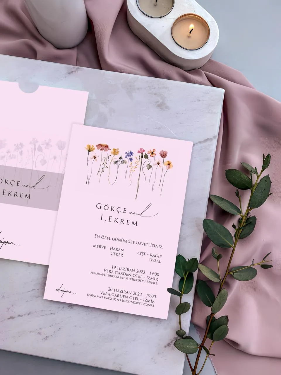 Görsel Temalar: Canlı kır çiçekleri demeti, modern kaligrafik isim vurgusu ve soft pembe zemin kurgusu.