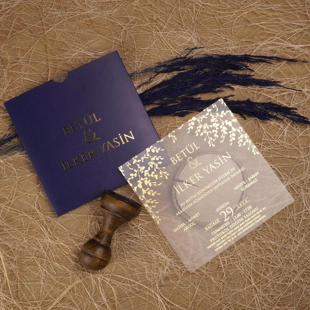 Bu modelde tercih edilen lacivert ve altın dore kombinasyonu; görkemli salon düğünleri, lüks otel törenleri ve akşam yemeği organizasyonları için kusursuz bir atmosfer yaratır. Asetatın dayanıklı yapısı, davetiyenizin yıllarca aynı ışıltıyla saklanacak bir hatıra objesine dönüşmesini sağlar. Zarafeti şeffaf bir asaletle mühürleyen BST-2677, en mutlu gününüzün en prestijli habercisi olacaktır.