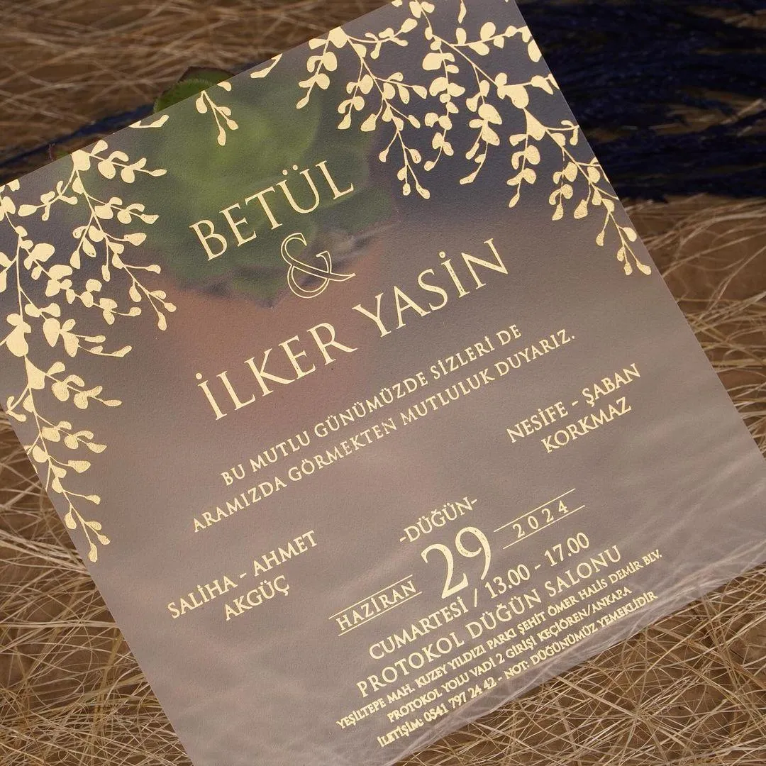 Yüksek kaliteli şeffaf asetat üzerine uygulanan profesyonel baskı, kartın üst kısımlarından narin bir şekilde süzülen altın varaklı yaprak ve dal illüstrasyonlarını mükemmel bir netlikte sunar. İç karttaki metinlerin asetatın pürüzsüz yüzeyinde adeta boşlukta süzülüyormuş gibi görünmesi, misafirleriniz için büyüleyici bir görsel deneyim yaratır. Bustinow kalitesiyle hazırlanan bu tasarım, şıklığı bir sanat eseri titizliğiyle sunuyor.