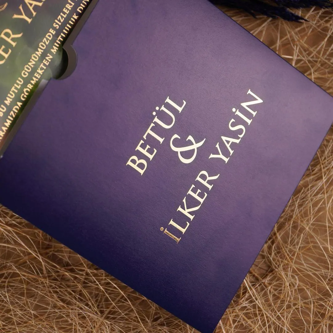 Asaleti şeffaf bir zarafetle buluşturan BST-2677 modelimiz, derin lacivert/mor lüks kılıfı ve gümüş/altın ışıltılı şeffaf asetat kartıyla dikkat çekiyor. “Betül & İlker Yasin” örneğinde görüldüğü gibi, kılıfın üzerine uygulanan altın varaklı isim baskısı, davetiyenize ilk bakışta yüksek bir prestij ve kişiselleştirilmiş bir dokunuş katmaktadır. Modern materyallerin klasik renklerle harmanlandığı bu model, her detayında lüksü hissettiriyor.