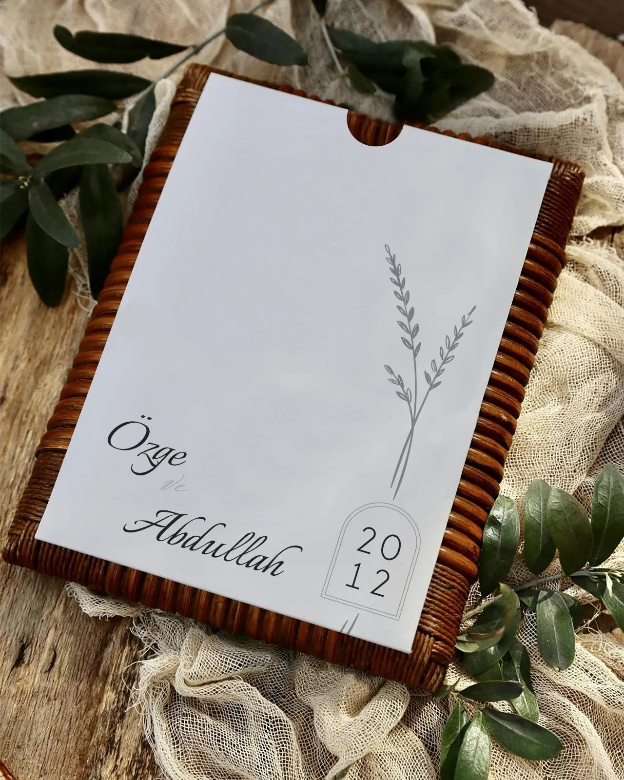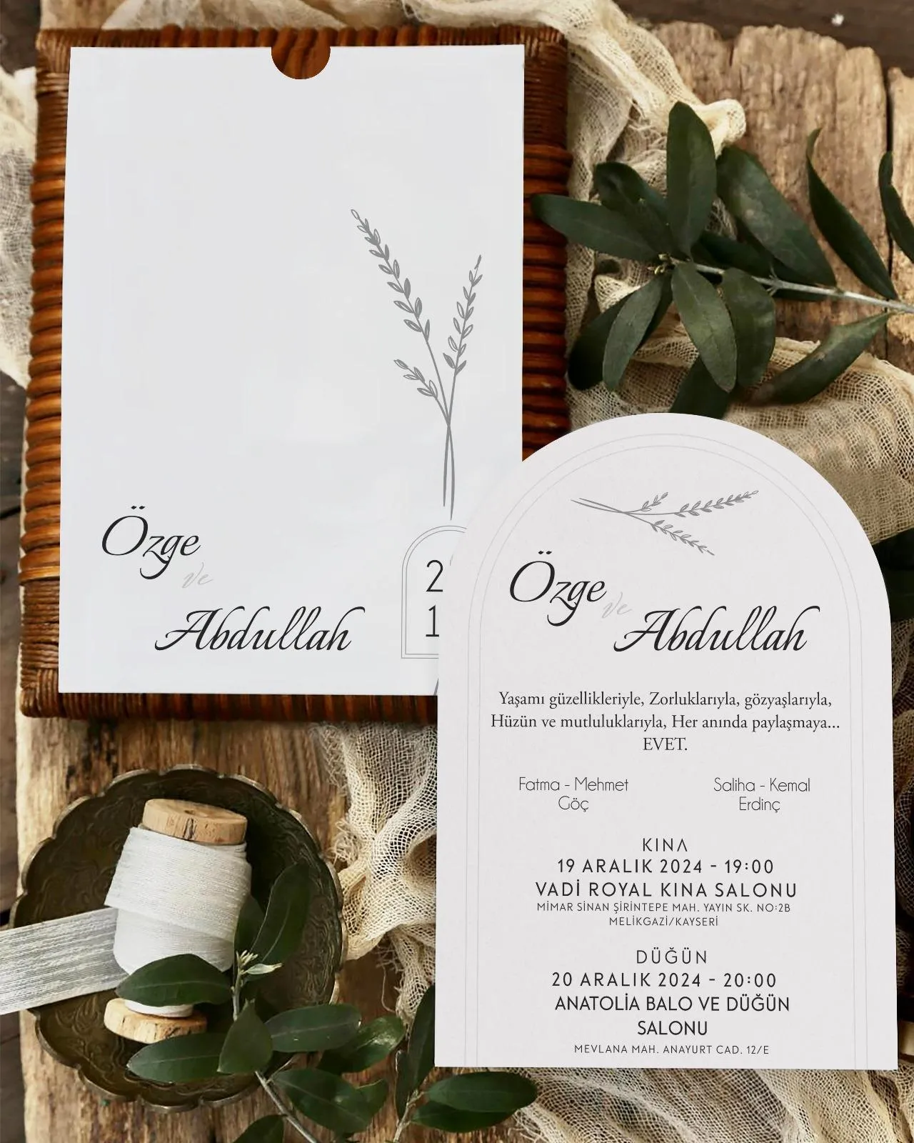 Yüksek kaliteli lüks mat beyaz kart stoğu üzerine uygulanan profesyonel baskı, hem kılıf hem de kart üzerinde yer alan narin başak illüstrasyonunun inceliğini ön plana çıkarır. Kartın en üstüne konumlandırılan ince dal figürü, tasarımın modern yapısına organik bir dokunuş kazandırırken isimlerin zarif kaligrafisiyle kusursuz bir uyum sergiler. Bustinow kalitesiyle titizlikle hazırlanan bu tasarım, minimalist estetiğin en seçkin örneklerinden biridir.