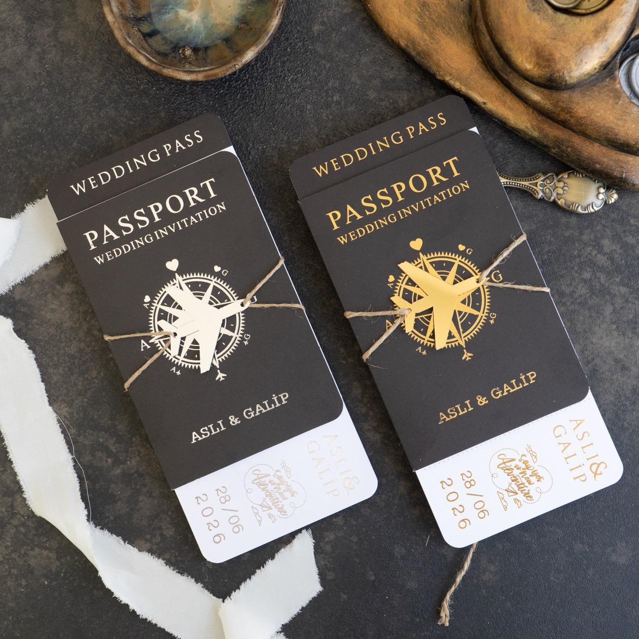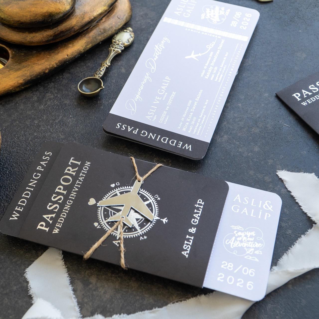 Tasarım Konsepti: Pasaport formunda lüks siyah dış kapak ve boarding pass (uçak bileti) formunda iç davetiye kartı.