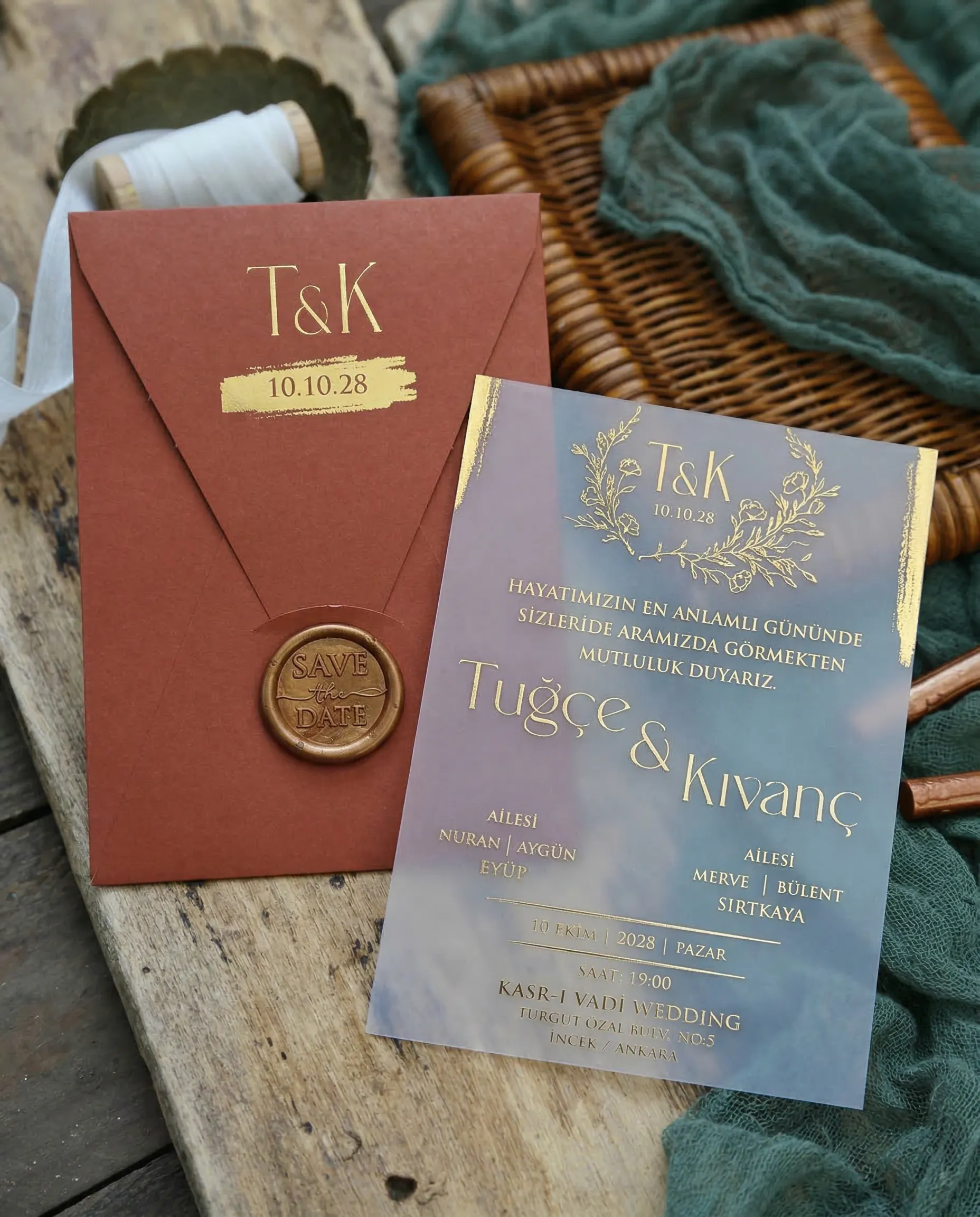 Tasarım Formu: Şeffaf buzlu (frosted) asetat iç kart ve dikey formlu, fırça darbesi detaylı kiremit rengi lüks zarf seti.