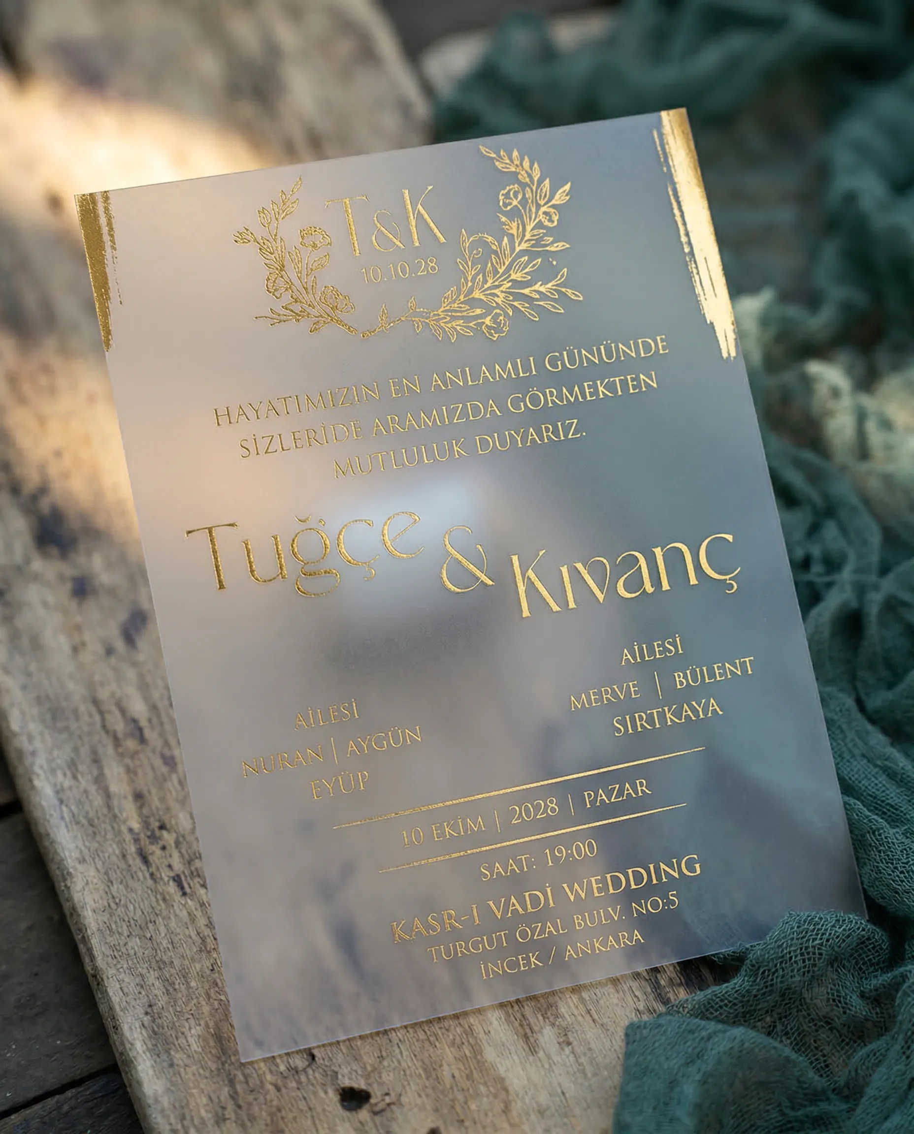 Uzman tasarım ekibimiz, isimlerinizi ve davet detaylarınızı asetat kart üzerindeki altın çelenk altına en dengeli şekilde yerleştirerek onayınıza sunar. Eğer siz de düğününüzde toprak tonlarının sıcaklığını altın bir ışıltı ve şeffaf bir dokuyla sergilemek istiyorsanız, BST-3001 sizin için en mükemmel ve görkemli seçimdir.