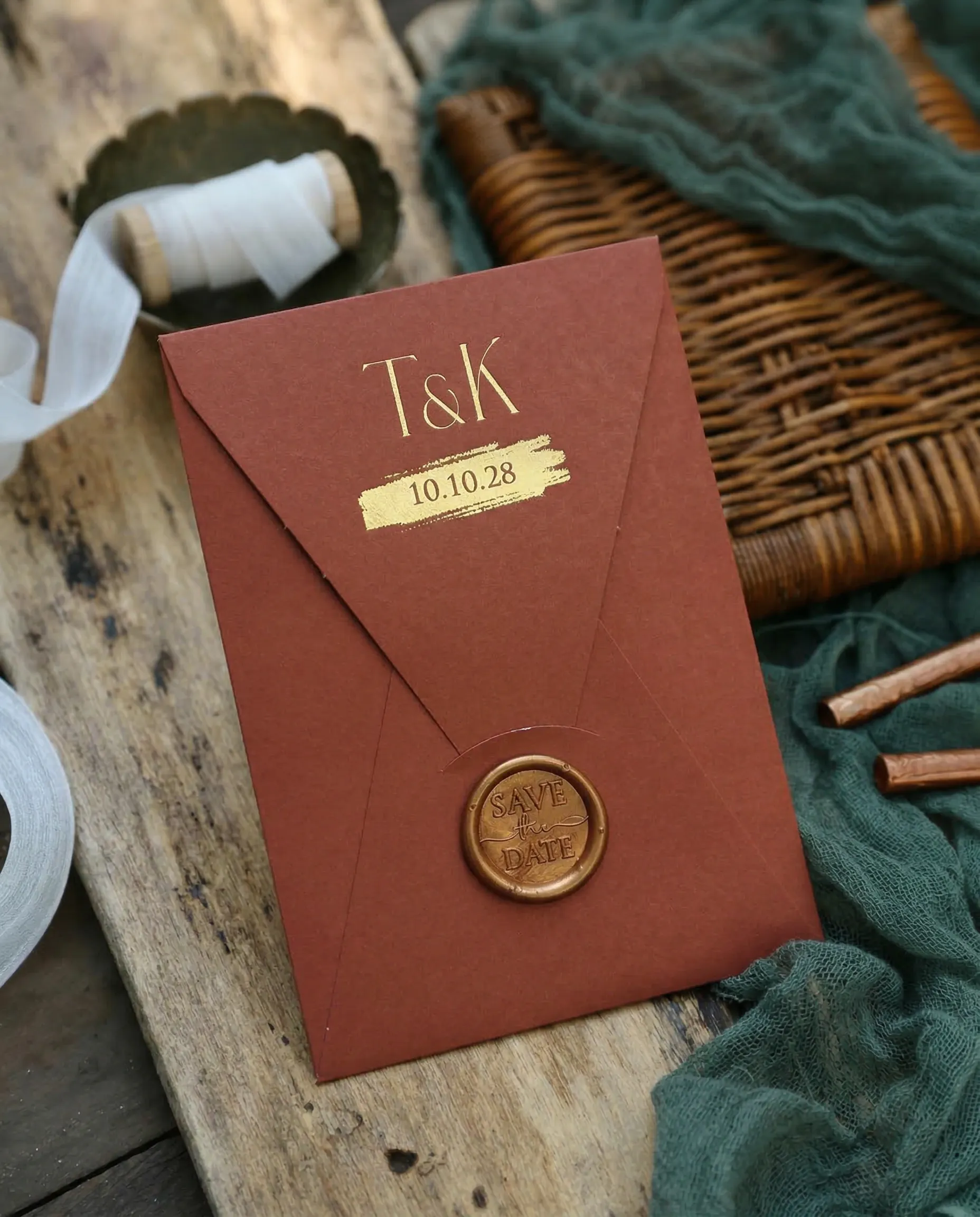 BST-3001 davetiye modeli, dikey açılan kiremit zarfını süsleyen “Save the Date” yazılı altın sarısı balmumu mühür detayıyla dikkat çeker. Mühürün klasik dokusu, zarf üzerindeki modern yaldız baskılarla mükemmel bir denge oluşturuyor. Görseldeki hasır sepet, dökümlü yeşil kumaşlar ve ahşap zemin üzerindeki sunum; bu modelin özellikle rustik, bohem ve sonbahar temalı düğünler için ne kadar ideal bir tercih olduğunu gösteriyor.