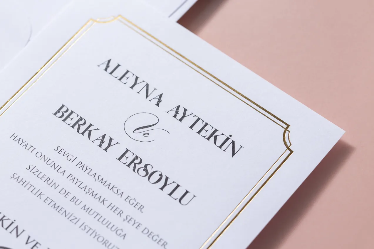 BST-7082 davetiye modeli, geleneksel beyaz davetiye formunu modern altın varak detaylarla birleştirerek her döneme hitap eden bir estetik oluşturur. İsimlerin yazımında kullanılan klasik serif fontlar, metin kısmındaki sade yazı karakterleriyle birleşerek kusursuz bir okunabilirlik sunar. Altın çerçevenin yarattığı derinlik hissi, beyaz kartın kalitesini ve dokusunu daha da belirginleştirir.