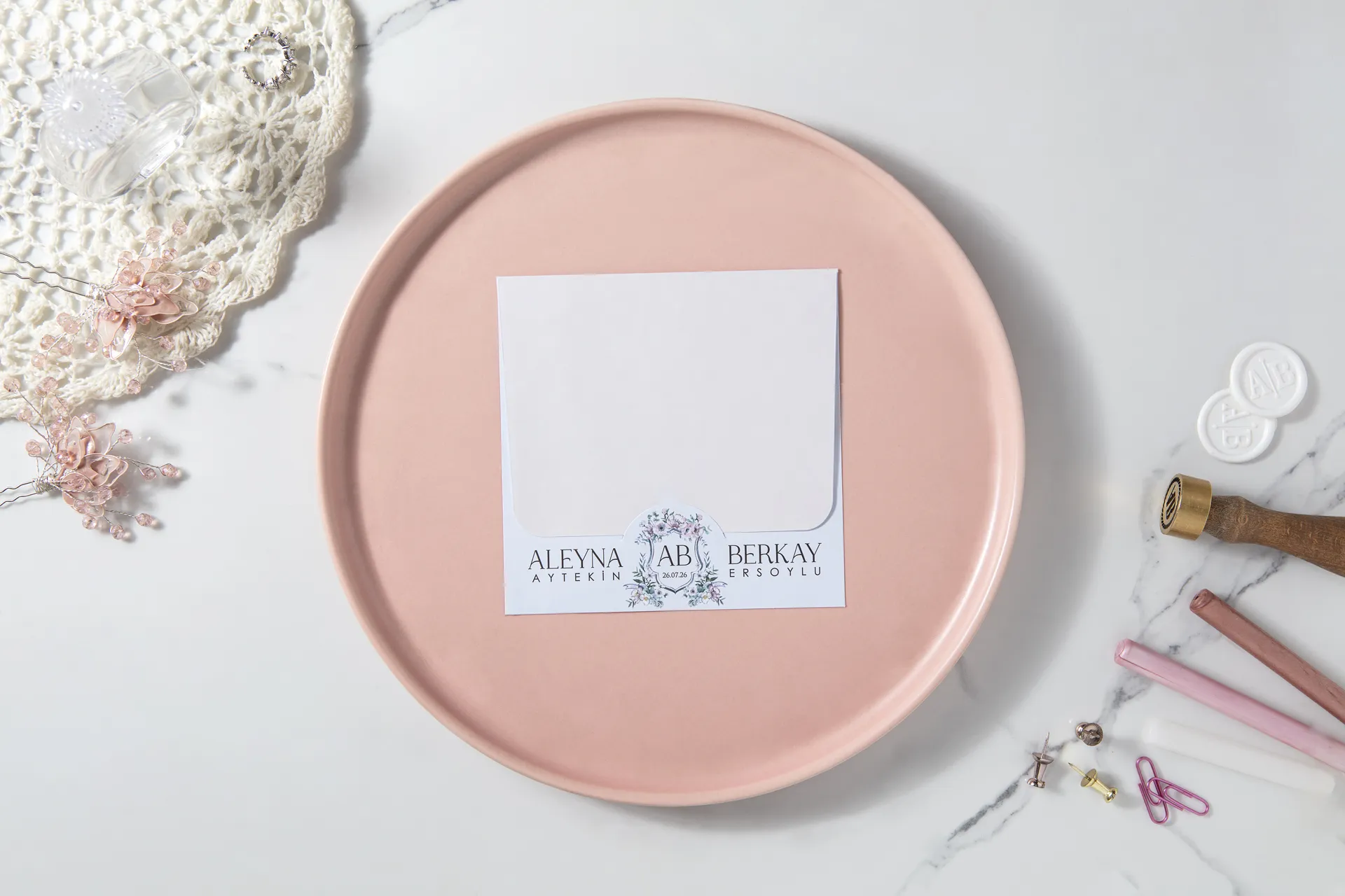 Bu modelde kullanılan pastel ve beyaz paleti; kır düğünlerinden sahil konseptli organizasyonlara, modern salon davetlerinden bahar kutlamalarına kadar her türlü düğün temasına kusursuz uyum sağlar. Görseldeki pembe tabak ve zarif aksesuarlarla sergilenen uyum, davetiyenizin masa dekorasyonunuzla ne kadar romantik bir birliktelik yakalayacağının kanıtıdır. Pastel çiçeklerin zerafetini kişisel bir monogramla birleştiren BST-7112, en özel gününüzün en nazik habercisi olacaktır.