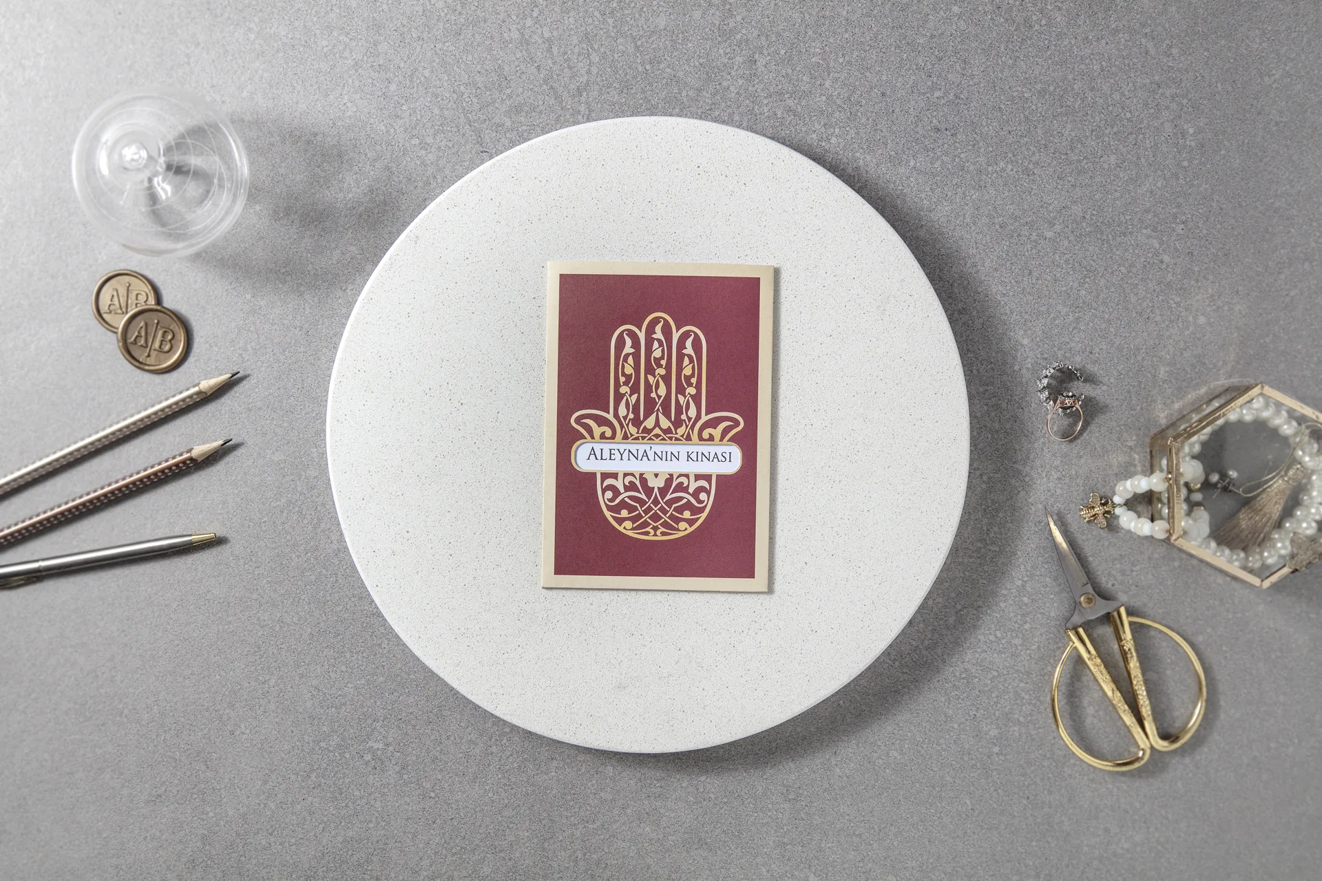 Kına gecesinin geleneksel ruhunu modern ve asil bir tasarımla buluşturan BST-7153 modelimiz, bordo ve altın sarısının ihtişamlı uyumuyla öne çıkıyor. Davetiyenin ön yüzünde yer alan büyük puntolu Fatma Ana Eli (Hamsa) motifi, içindeki zarif bitkisel desenler ve altın varaklı baskısı ile hem koruyucu bir sembol hem de estetik bir şölen sunuyor. Bordo zemin üzerinde parlayan bu geleneksel motif, kına gecenizin ağırlığını ve zerafetini ilk bakışta misafirlerinize hissettiriyor.