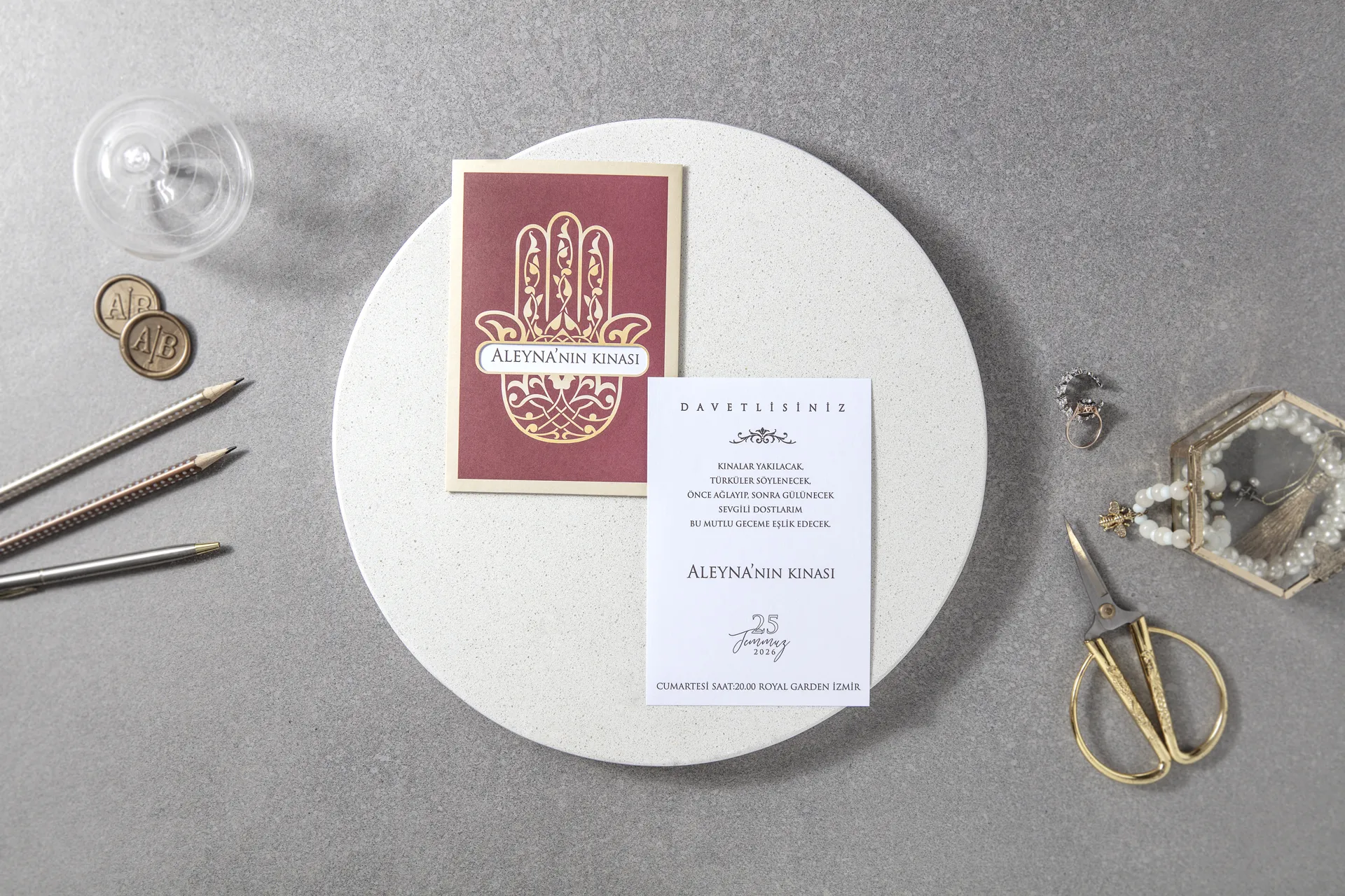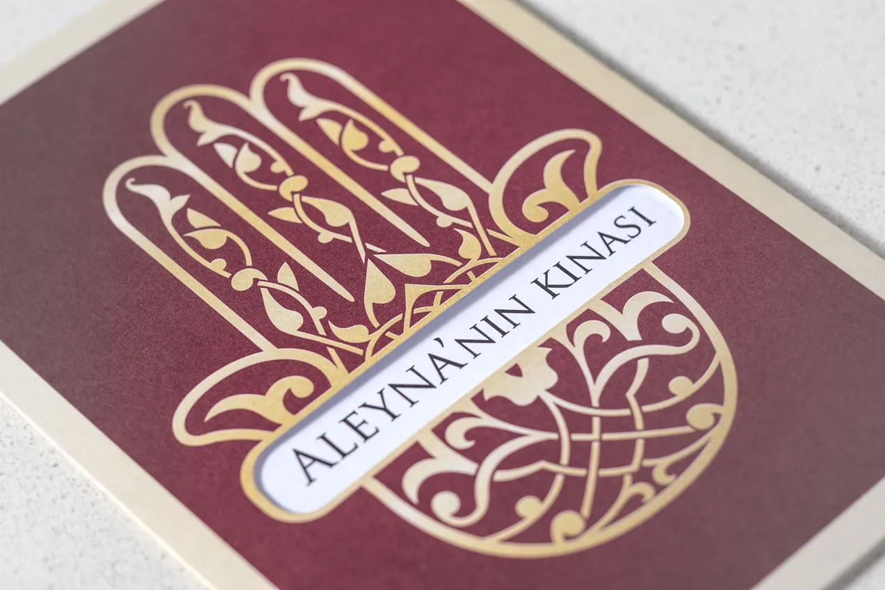 Tasarım Formu: Bordo dış zarf üzerine altın varaklı Fatma Ana Eli motifli kına davetiyesi.